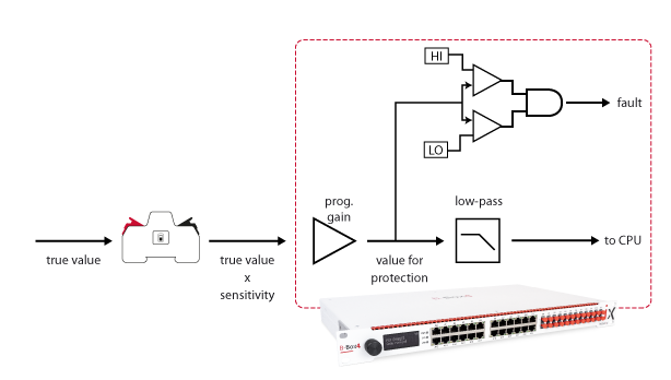 $$ \text{value for protection} = \text{true value} * \text{sensor sensitivity} * \text{programmable gain}$$