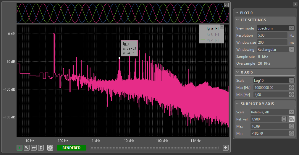 All Oversampled signals are compatible with the various metrics calculated in the bottom bar, as well as with the Formula Builder. ADC channel signals and Oversampled probes are also compatible with the Spectral Analyzer, enabling the user to see the spectra of these signals above the Nyquist frequency defined by their control loop rate.