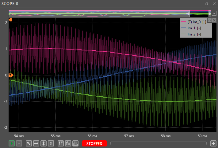 The Scope module allows the user to display control signals on an oscilloscope-like interface by capturing and plotting every sample of the scoped user variables. The acquisition is done at the control task rate (i.e. the main interrupt frequency of the controller), ensuring that each and every sample is scoped.